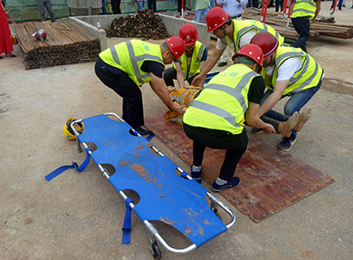 本次模擬情景是在項(xiàng)目東南側(cè)基坑墊層施工中,南側(cè)-5m處6名施工人員在平整土方時(shí)邊坡土體突然坍塌,工人張某被滑落土方掩埋。該路段土質(zhì)屬于回填土,邊坡上部可能有繼續(xù)坍塌的趨勢(shì)。項(xiàng)目經(jīng)理即刻啟動(dòng)了應(yīng)急救援預(yù)案。救援組所有成員攜帶救援工具趕到事故現(xiàn)場(chǎng),通迅組人員立即向相關(guān)領(lǐng)導(dǎo)及主管部門(mén)報(bào)告事故情況并請(qǐng)求支援。