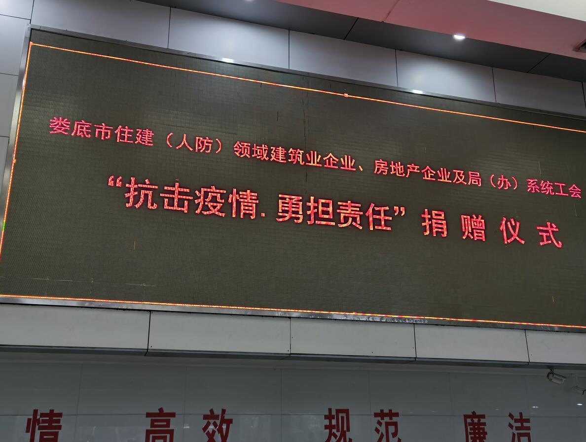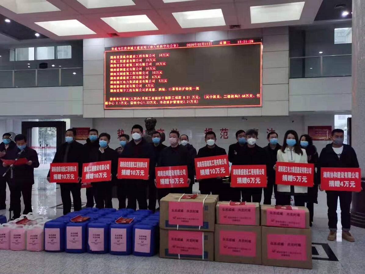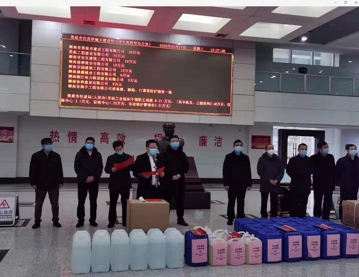 “病毒無情人有情”、“一方有難八方支援”!2020年2月11日,在婁底市住建局(人防辦)組織的市住建(人防)領(lǐng)域建筑業(yè)企業(yè)、房地產(chǎn)企業(yè)及局(辦)系統(tǒng)工會“抗擊疫情,勇?lián)?zé)任”捐贈儀式上,公司總經(jīng)理、法人代表胡勁代表婁底工程建設(shè)有限公司捐贈人民幣10萬元,為抗擊新冠病毒肺炎疫情盡企業(yè)的一份社會責(zé)任。公司董事長張愛慧參加了捐贈儀式。