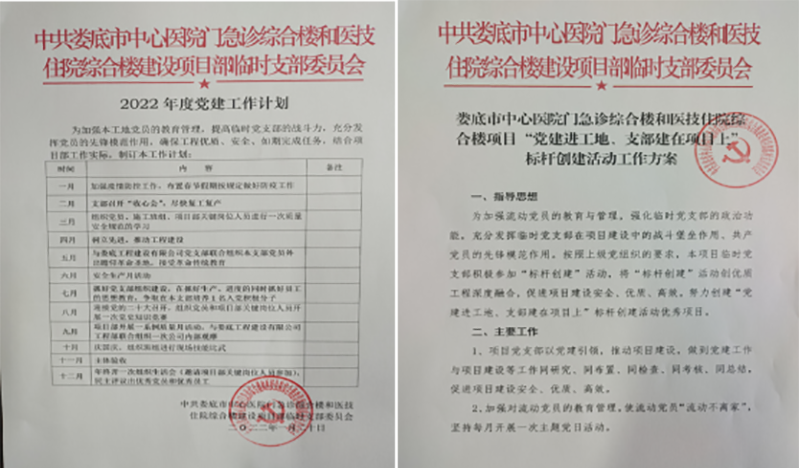 該項目地處婁底市最繁華街道的十字路口,又是婁底市最大的單體建筑公共項目。項目中標后,公司立即配備優(yōu)秀骨干組建項目部班子,并成立了中共婁底市中心醫(yī)院門急診綜合樓和醫(yī)技住院綜合樓建設項目部臨時支部委員會,推舉項目經(jīng)理姚春旭擔任臨時黨支部書記,并安排了黨建指導員。該支部目前有黨員8人。項目部設置了黨員活動室,文化走廊等,臨時黨支部“五化”建設達標。